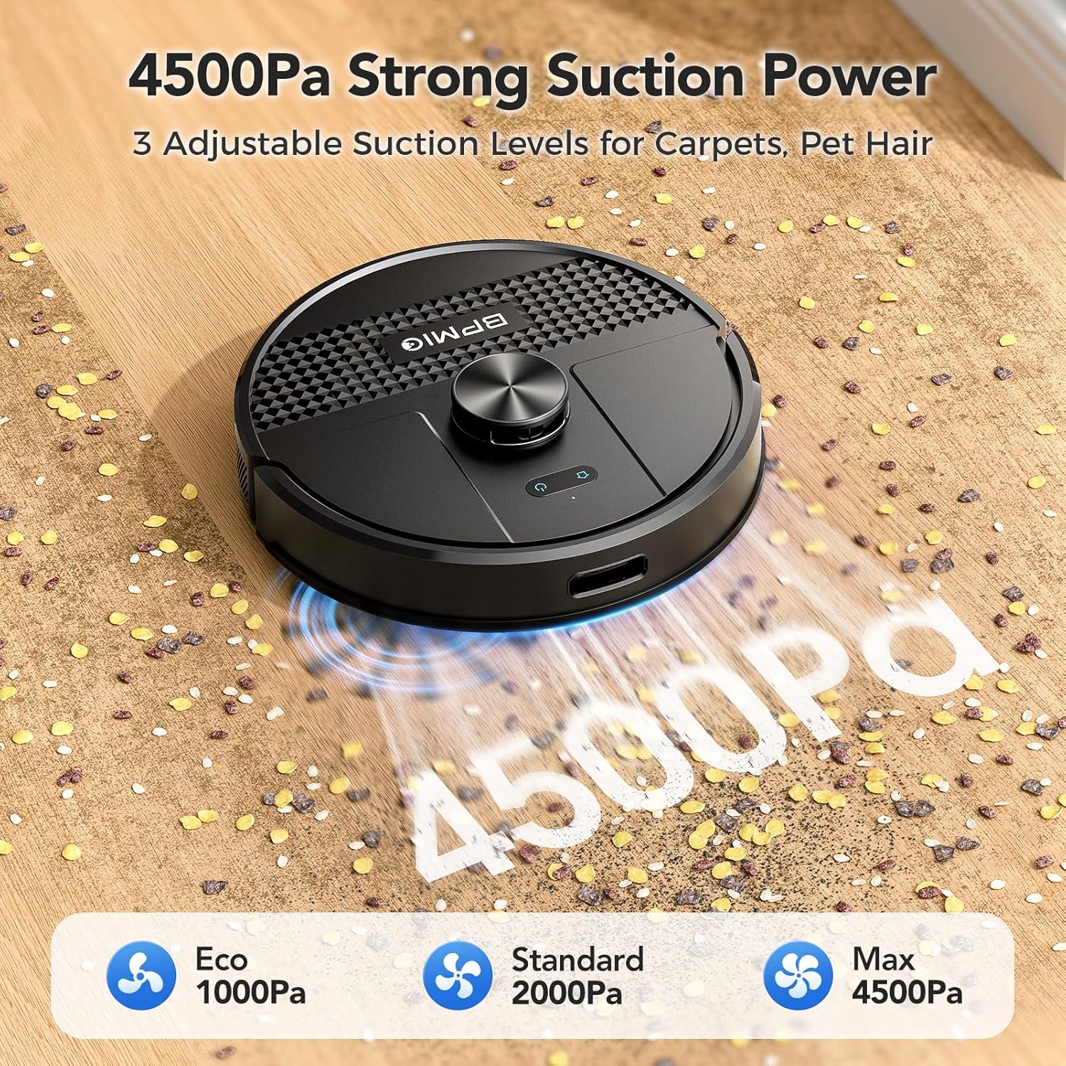 BPMIO Robot Vacuum and Mop Combo 4500Pa Max Suction with LiDAR Navigation Smart Mapping, 145 Min Runtime Customized Cleaning Schedule, Works with Alexa/WiFi/App, Great for Pet Hair, Carpet, Hard Floor